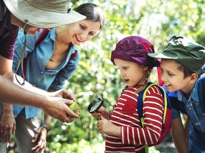 Eine Familie mit zwei kleinen Kindern ist in der Natur unterwegs und erforscht etwas mit einer Lupe.