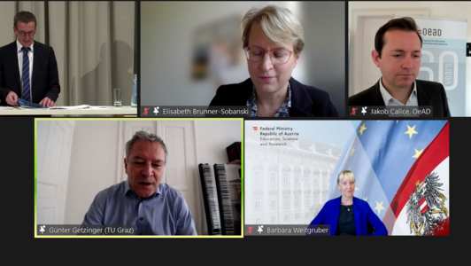 Es diskutierten Elisabeth Brunner-Sobanski (FH Campus Wien), Jakob Calice (OeAD), Günter Getzinger (TU Graz & Allianz nachhaltiger Universitäten) und Barbara Weitgruber (BMBWF). Moderation: Gerhard Volz (OeAD)